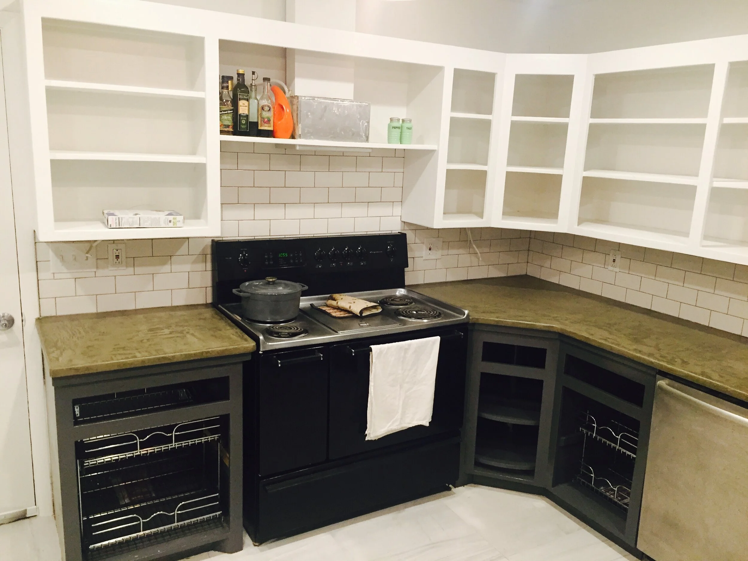 We loved the look of concrete countertops. We found a product at a local concrete store that is a thin concrete you can overlay on existing surfaces. And, yes, it works over existing granite countertops!