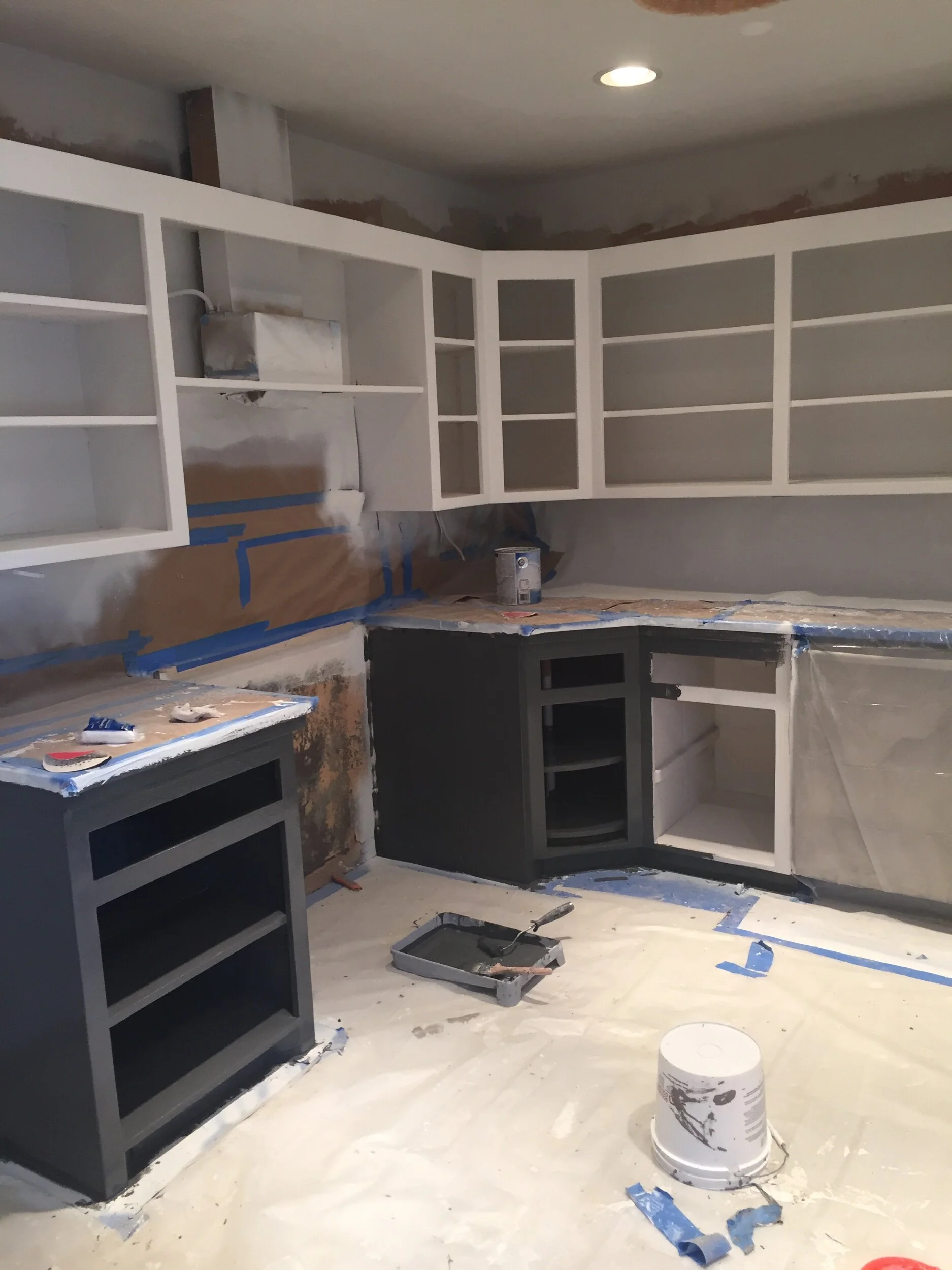Painted the upper cabinets the color Snowbound satin from Benjamin Moore. We decided to paint the lower cabinets a darker color and chose Southwest Peppercorn also Benjamin Moore. We still have to paint the space above the cabinets.
