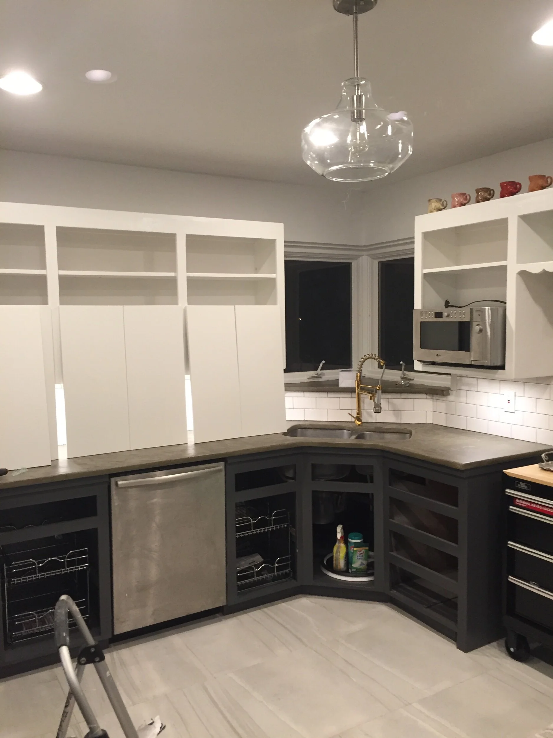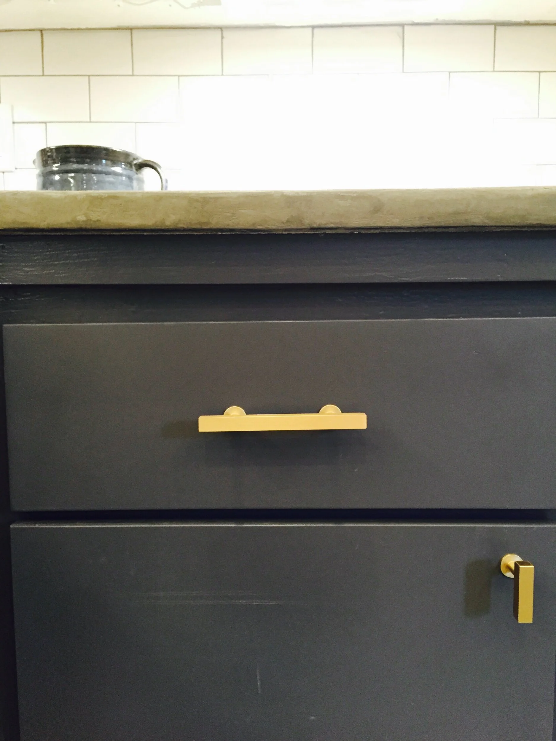 Custom cabinet doors made from mdf installed and new gold modern hardware. Also the concrete countertop is looking smooth.